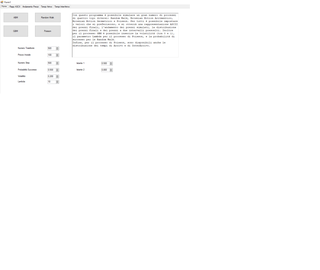 Il seguente programma permette di ottenere simulazioni per il processo di Poisson, Random Walk, ABM e GBM